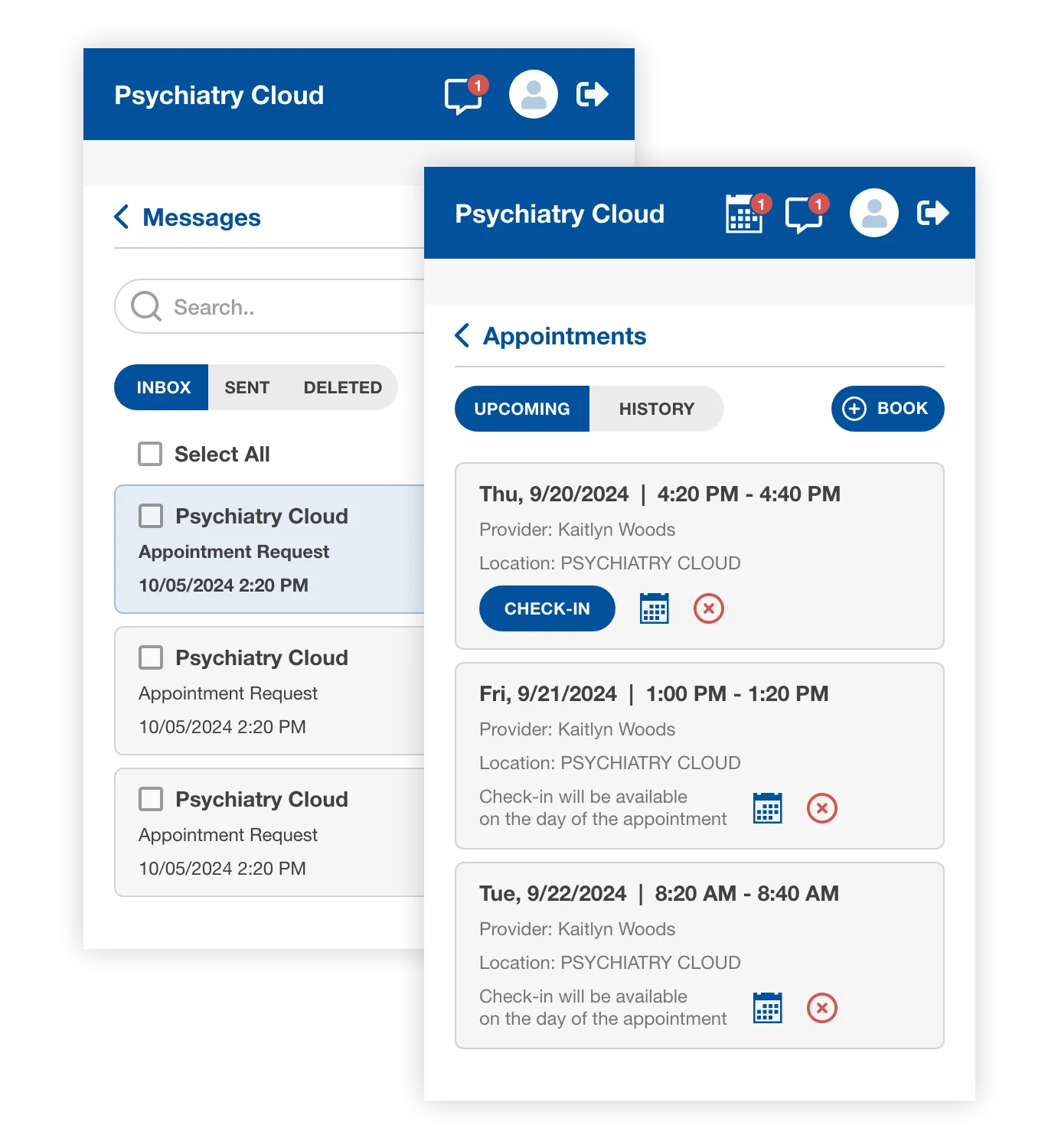 Stay compliant with the latest standards, such as CMS’s Promoting Interoperability Program, by utilizing secure electronic messaging. Psychiatry-Cloud allows for safe, private messaging, including telehealth, so individuals can correspond with your practice easily.
