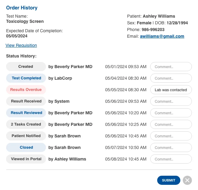 As with health maintenance reminders, your practice determines the parameters and the patient outreach occurs automatically. Additionally, all ordered tests, results, and patient communications are all documented within the EHR.